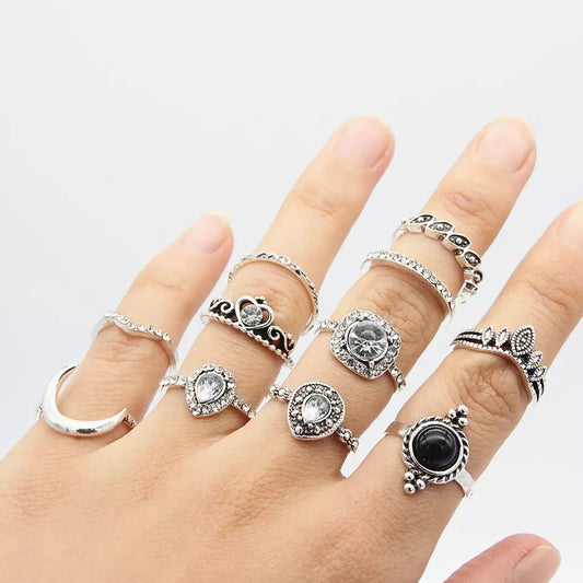 10pcs Vintage Rhinestone Knuckle Midi Stacking Boho Ring Set