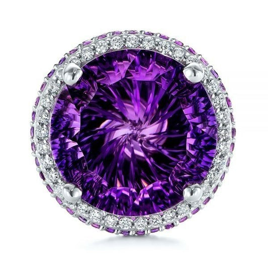 12mm Round Cut Purple Amethyst & CZ Crystal Silver Ring