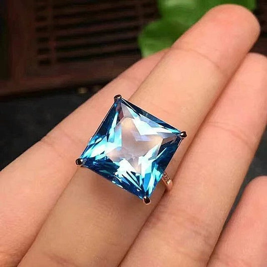 12mm Sterling Silver Filled Sea Blue Square Rhinestone Inlaid Ring