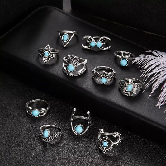 11pcs Bohemian Retro Turquoise Crescent Owl Silver Ring Set